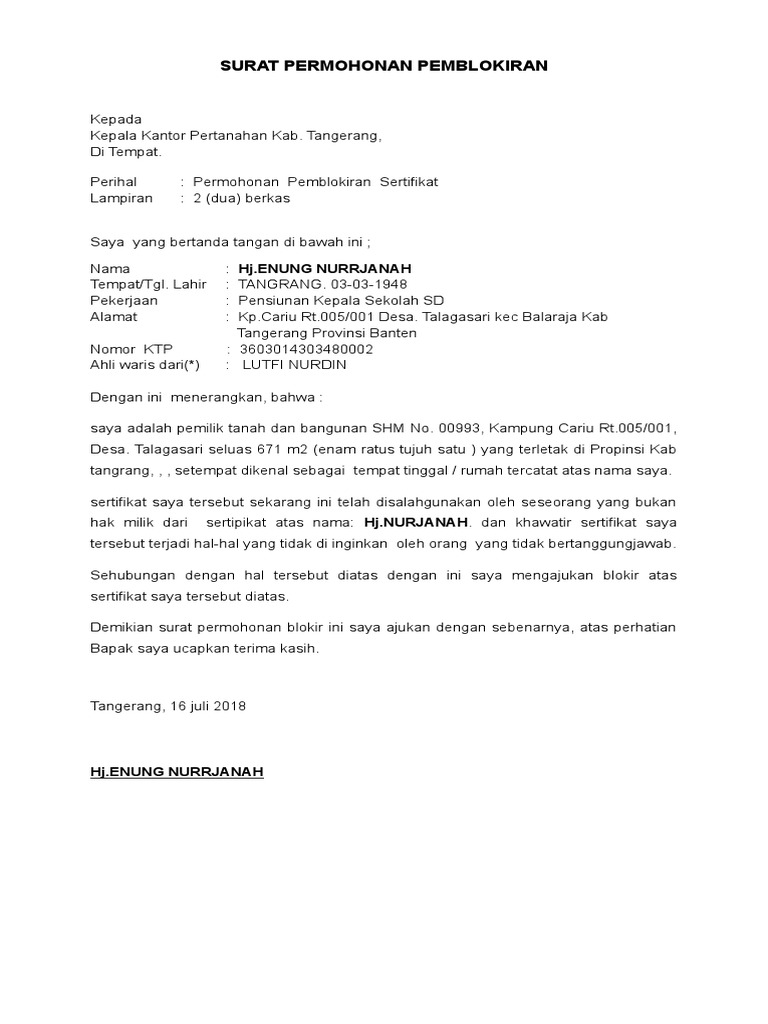 Contoh surat pemblokiran sertifikat tanah Contoh Surat Permohonan Pemblokiran Sertifikat Tanah Kumpulan Surat Penting
